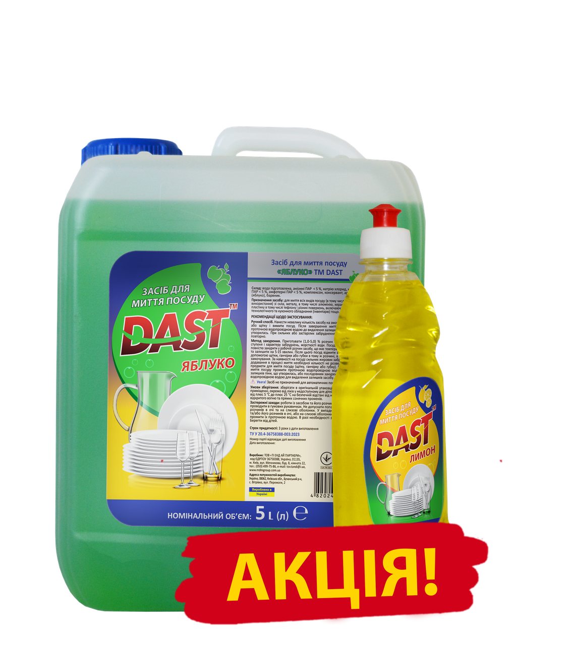 Акційний набір для сяючої чистоти кухні DAST: 5 л засобу для миття посуду з ароматом яблука у каністрі + 500 мл засобу для миття посуду з ароматом лимона — практичне, економне та ароматне рішення для щоденного миття посуду. Обидва засоби швидко розчиняють жир, ефективно видаляють залишки їжі та навіть найстійкіші забруднення, залишаючи посуд бездоганно чистим і наповнюючи кухню свіжими фруктовими нотками.