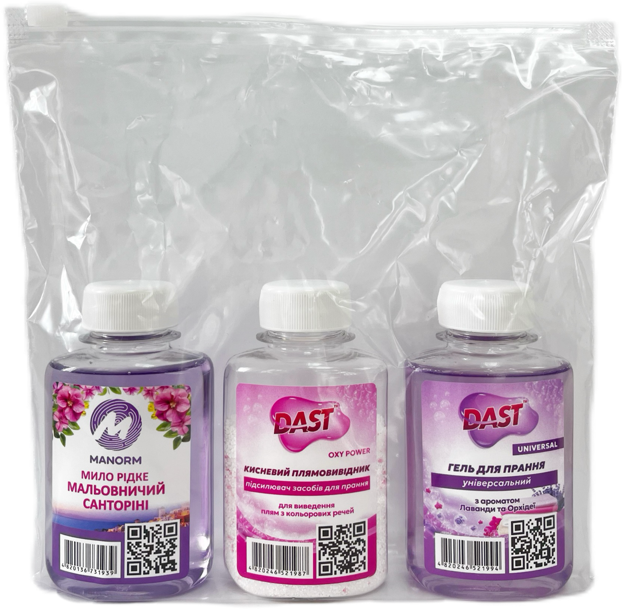 Дорожній набір побутової хімії: гель для прання 100 мл, кисневий плямовивідник 100 г, рідке мило 100 мл