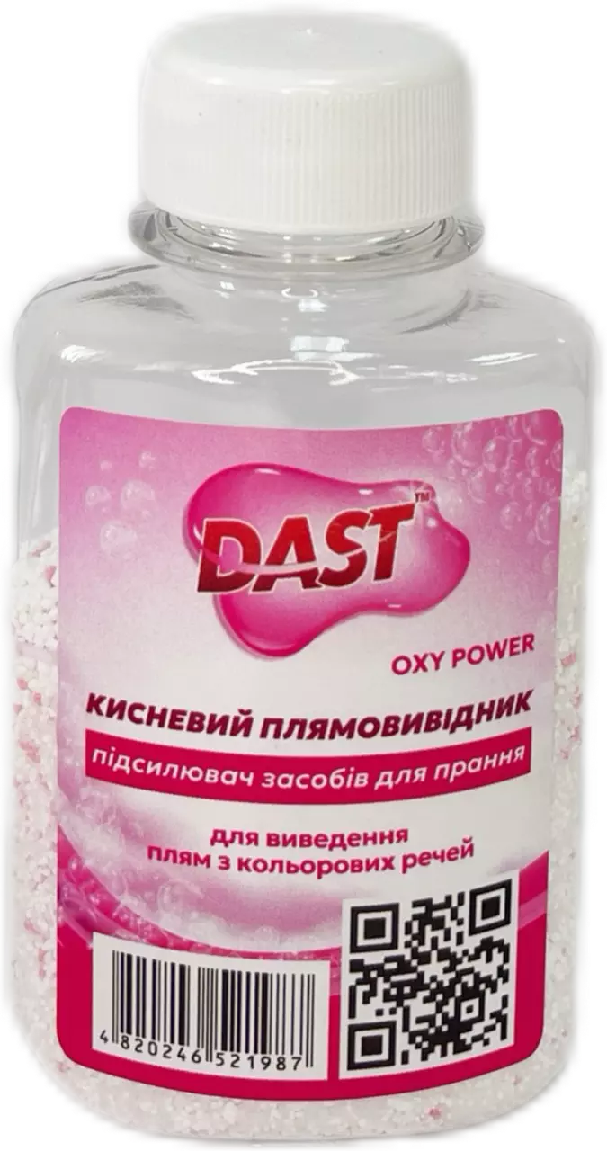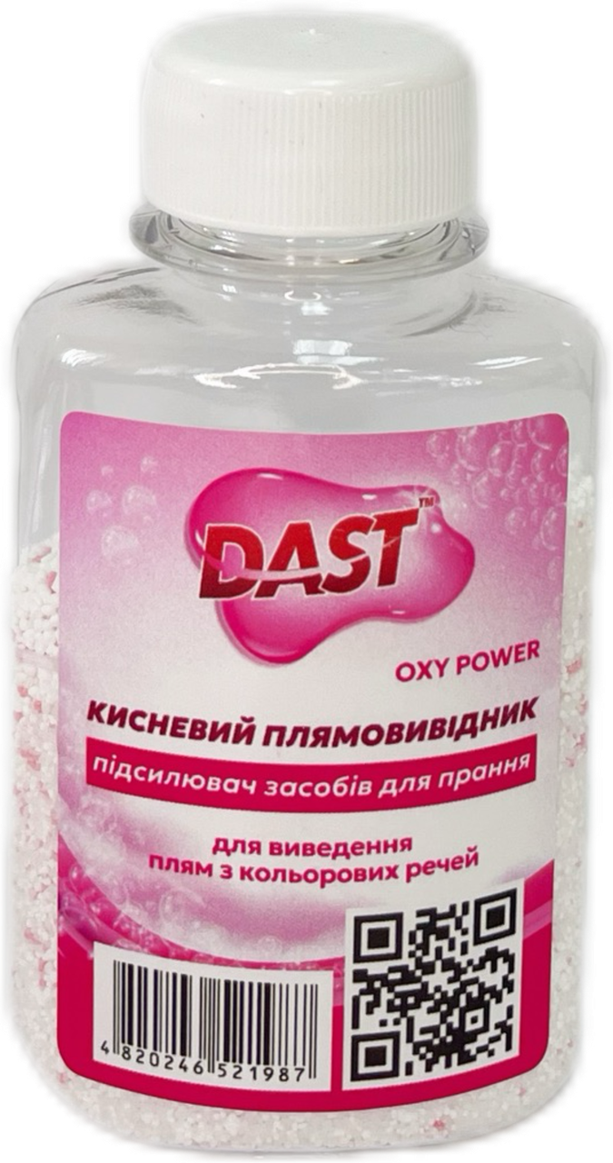 - Кисневий плямовивідник для кольорових речей Dast. Ефективно видаляє складні забруднення (жир, ягоди, кров, чай, тощо) з білих і кольорових тканин. Може використовуватись для замочування або як додаток до основного мийного засобу. Не містить хлору, допомагає зменшити утворення накипу.