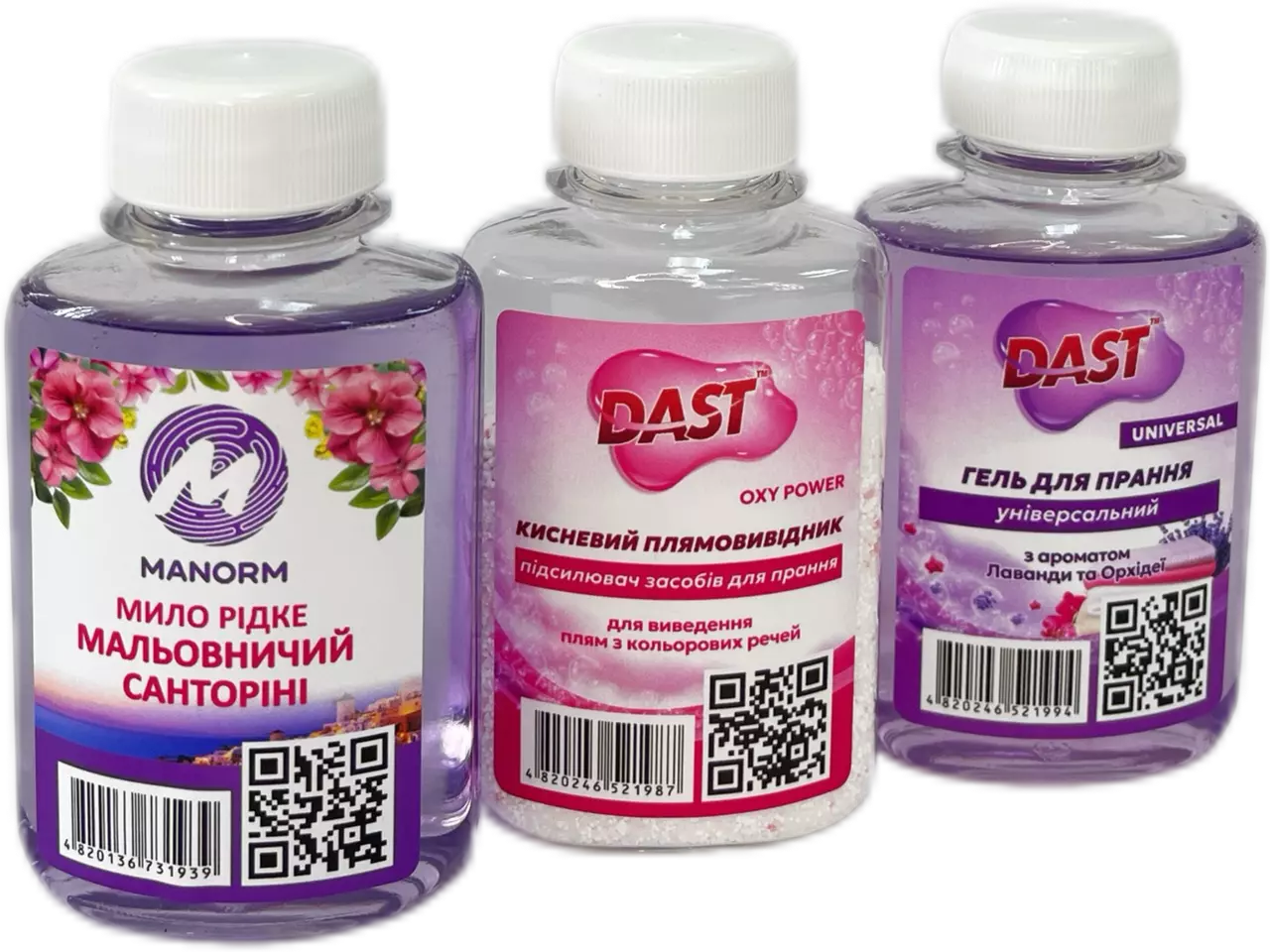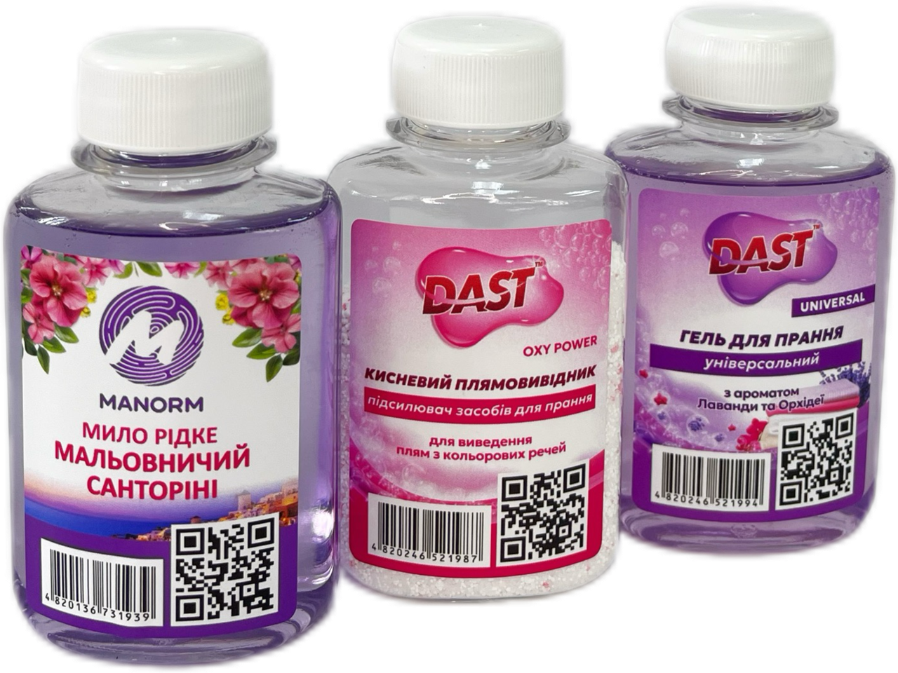 - Гель для прання універсальний з ароматом лаванди та орхідеї Dast . Універсальний засіб для прання білих та кольорових речей. Ефективно очищує при 30–90 °С, зберігає насиченість кольору, не містить фосфатів і легко споліскується. Має стійкий, приємний аромат лаванди та орхідеї. Підходить для прання дитячих речей з 3 років.