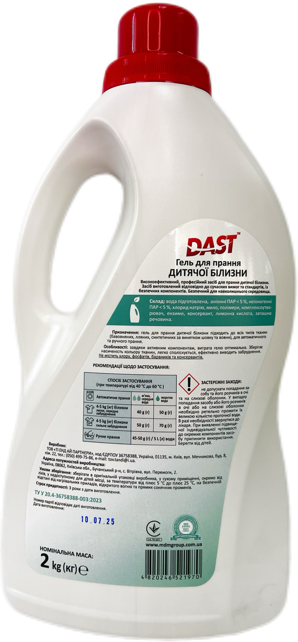 Гель для прання дитячої білизни DAST - це ефективний мийний засіб, спеціально розроблений для прання дитячої білизни з бавовняних, лляних і синтетичних тканин (за винятком шовку та вовни). Гель являє собою прозору безбарвну рідину з легким ароматом, яка делікатно, але ретельно видаляє органічні й неорганічні забруднення, не залишаючи плям чи нальоту. Завдяки спеціальній формулі засіб не фіксує бруд, легко виполіскується та зберігає яскравість тканин. Ефективний при температурі від 40 °С до 60 °С, підходить для ручного та машинного прання.