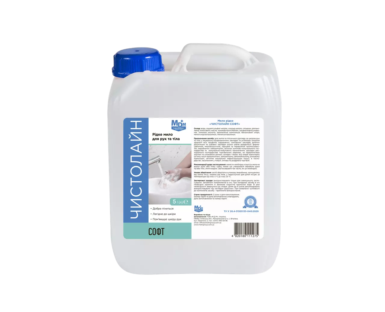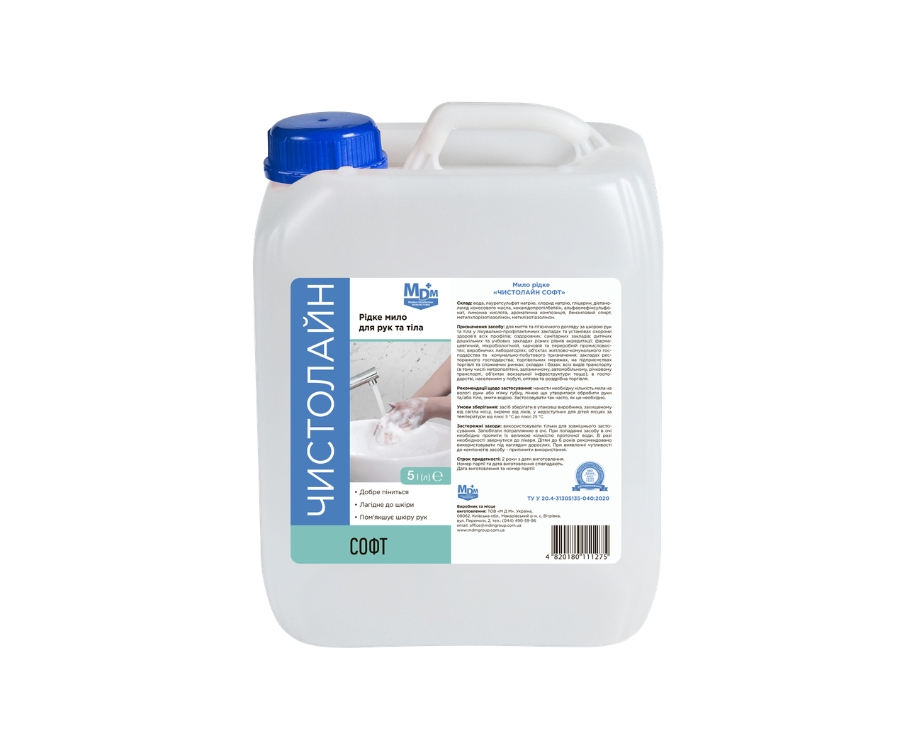 Рідке мило «Чистолайн Софт» — це готовий до використання м’який гігієнічний засіб для щоденного миття рук і тіла. Формула на основі делікатних ПАР із додаванням гліцерину забезпечує ефективне очищення, не пересушує шкіру та підтримує її природний ліпідний баланс. Засіб має приємну консистенцію, ніжний аромат і може використовуватись як у рідкому вигляді, так і у формі піни при застосуванні дозатора. Підходить для всіх типів шкіри, у тому числі чутливої та дитячої.