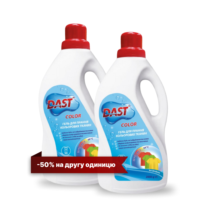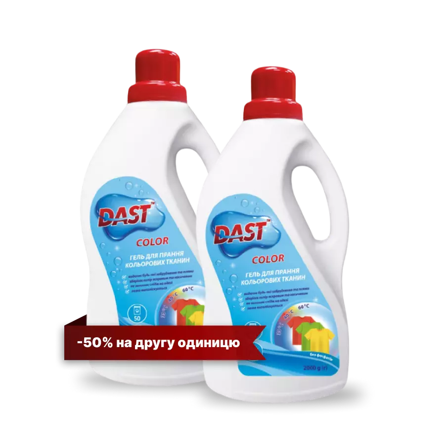 Спеціальна пропозиція для ефективного прання кольорових тканин: купуй один гель TM DAST і отримай другий зі знижкою 50%!