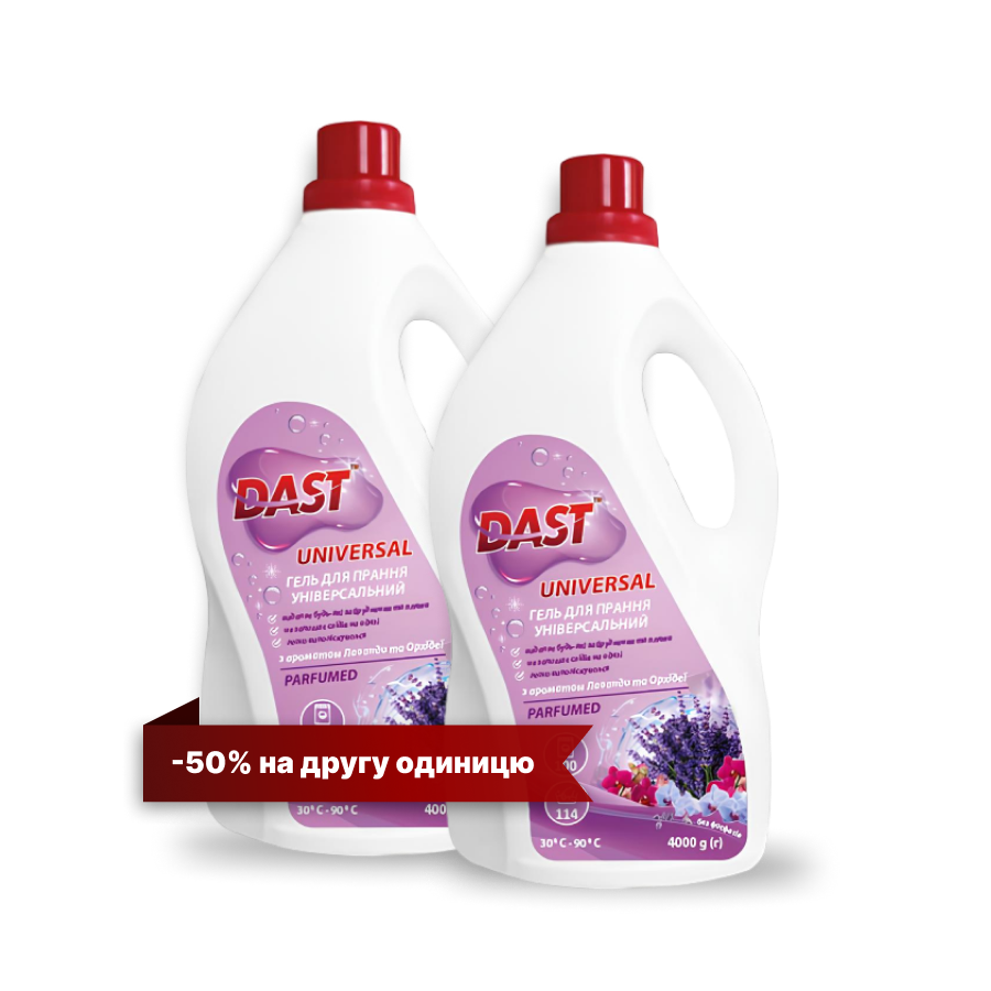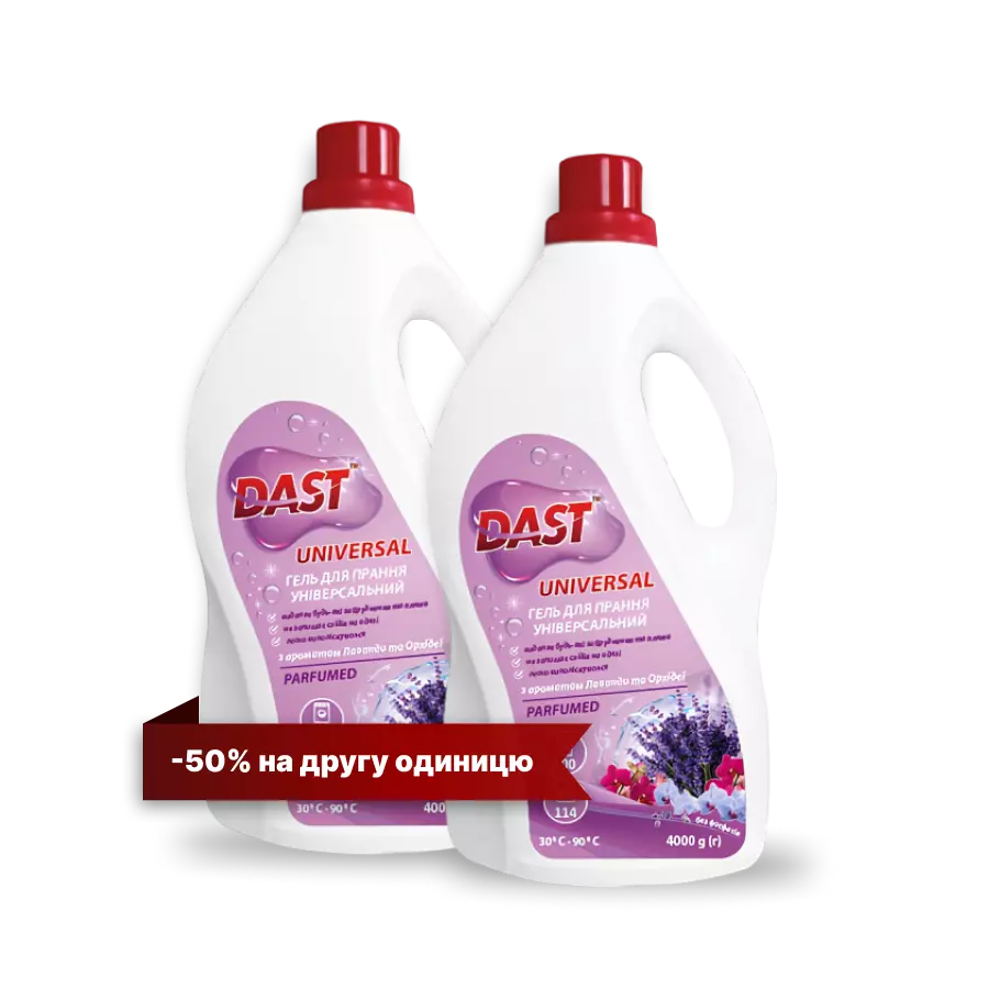 Спеціальна пропозиція для ефективного прання тканин: купуй один гель TM DAST і отримай другий зі знижкою 50%!