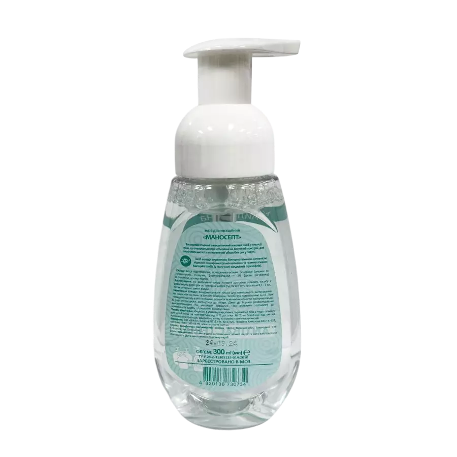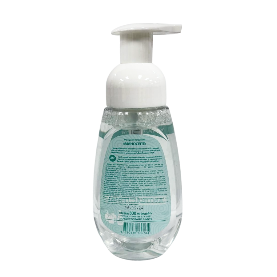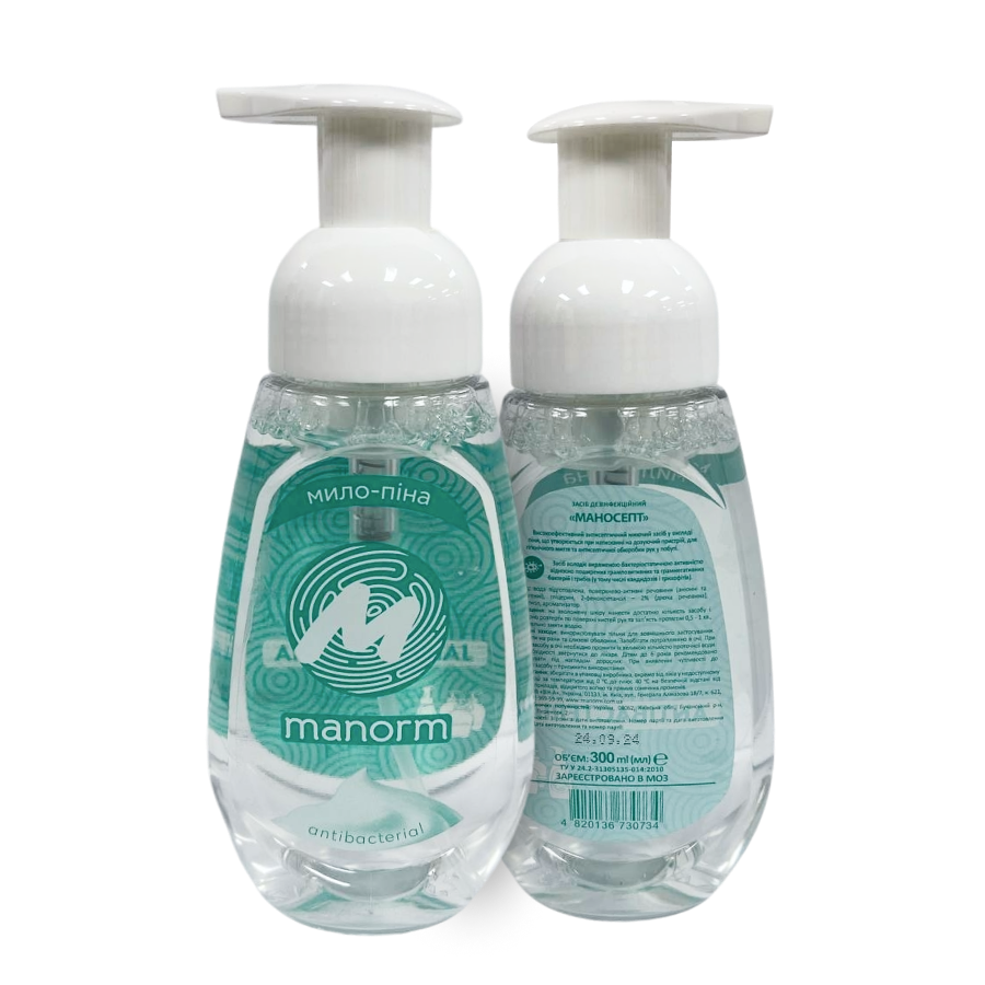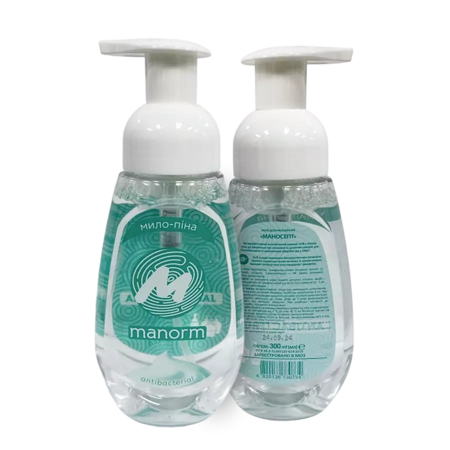 Рідке мило-піна «Маносепт» ТМ "Манорм" — готовий до використання дезінфекційний засіб для гігієнічного миття та антисептичної обробки шкіри рук. М'яка піна дбайливо очищає шкіру, не подразнює та не пересушує її, підтримуючи природний ліпідний баланс. Засіб володіє потужною бактерицидною та протигрибковою дією.