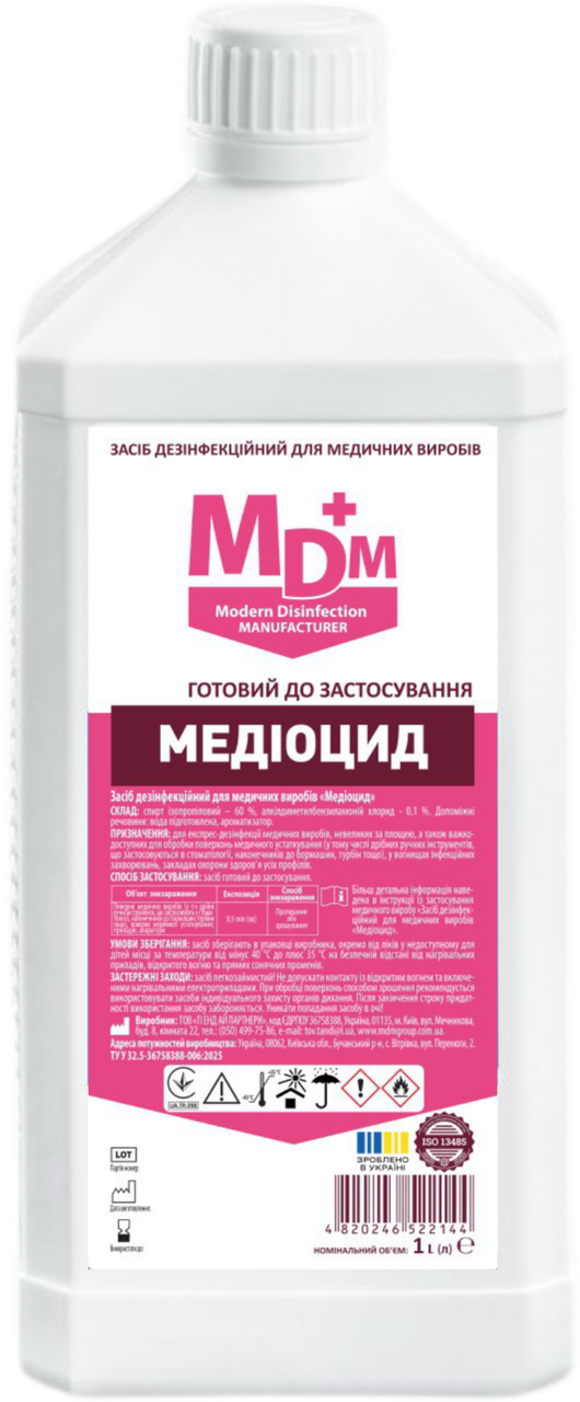 Засіб дезінфекційний для медичних виробів Медіоцид - готовий до використання дезінфекційний засіб швидкої дії у вигляді безбарвної прозорої рідини. Має виражену бактерицидну, віруліцидну, фунгіцидну та туберкулоцидну активність. Не фіксує білкові забруднення, не залишає нальоту, швидко висихає. Сумісний із більшістю матеріалів (метал, скло, гума, полімери), за винятком поверхонь, чутливих до спиртів (низькосортні фарби, лак, акрилове скло).