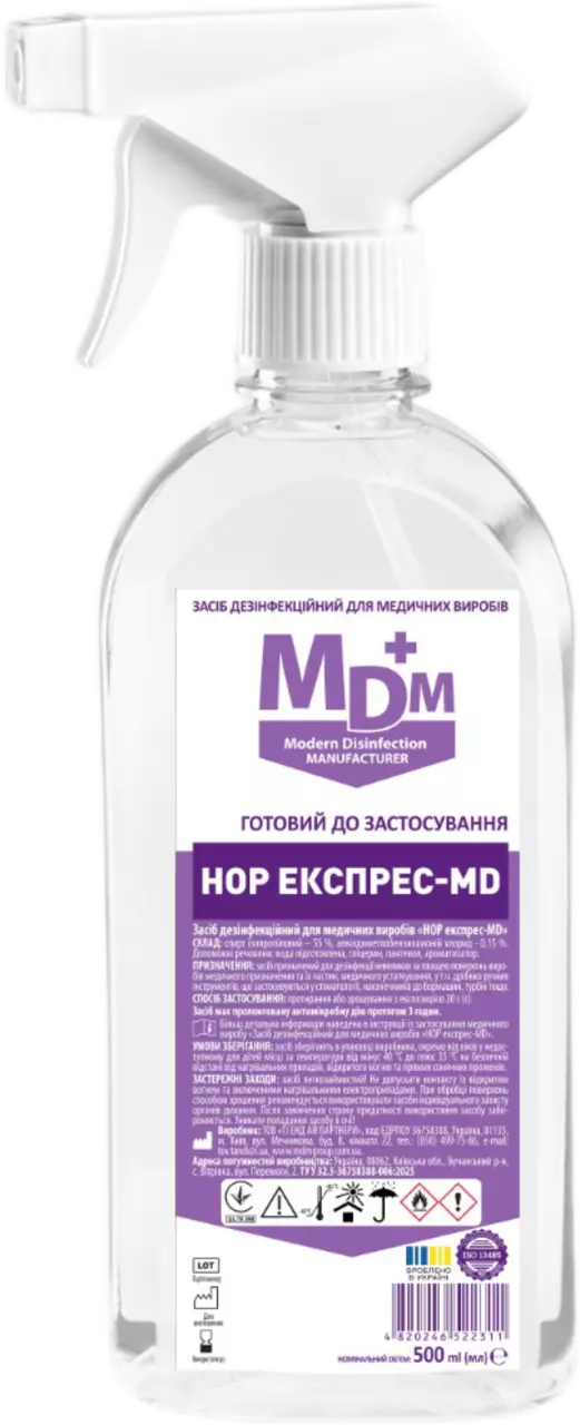 Засіб дезінфекційний для медичних виробів НОР експрес-MD - готовий до застосування дезінфекційний засіб у вигляді прозорої безбарвної або забарвленої рідини із характерним запахом спирту. Має виражену бактерицидну, віруліцидну, фунгіцидну та туберкулоцидну дію. Підходить для швидкої дезінфекції медичних виробів, у тому числі дрібних інструментів, стоматологічних наконечників, бормашин, турбін та поверхонь медичного обладнання. Не пошкоджує більшість матеріалів, не фіксує білкові забруднення, швидко висихає та не потребує змивання (окрім випадків контакту зі слизовими оболонками). Має пролонговану антимікробну дію до 3 годин.