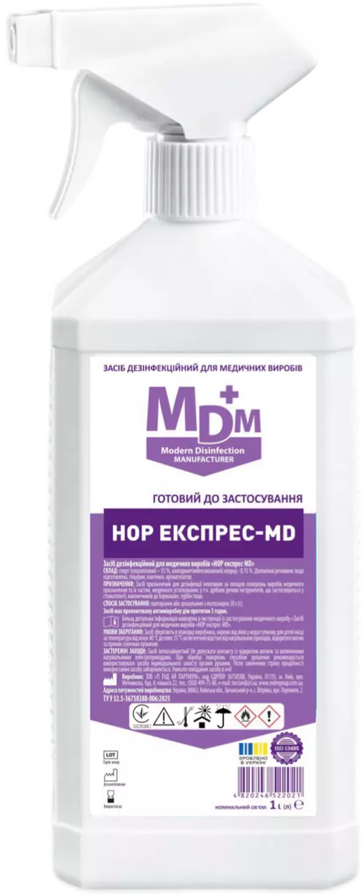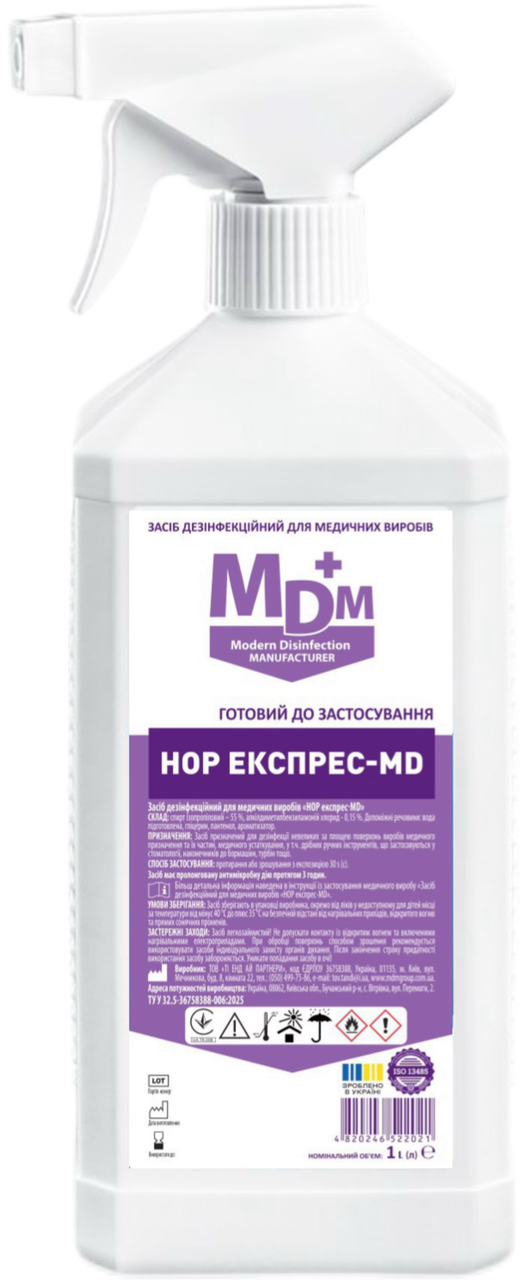 Засіб дезінфекційний для медичних виробів НОР експрес-MD - готовий до застосування дезінфекційний засіб у вигляді прозорої безбарвної або забарвленої рідини із характерним запахом спирту. Має виражену бактерицидну, віруліцидну, фунгіцидну та туберкулоцидну дію. Підходить для швидкої дезінфекції медичних виробів, у тому числі дрібних інструментів, стоматологічних наконечників, бормашин, турбін та поверхонь медичного обладнання. Не пошкоджує більшість матеріалів, не фіксує білкові забруднення, швидко висихає та не потребує змивання (окрім випадків контакту зі слизовими оболонками). Має пролонговану антимікробну дію до 3 годин.