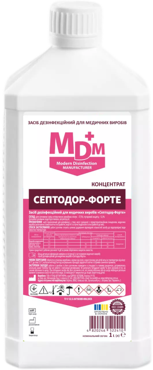 Засіб дезінфекційний для медичних виробів Септодор-Форте — багатофункціональний концентрований дезінфекційний засіб широкого спектра дії. Має виражені бактерицидні, віруліцидні (включаючи віруси гепатитів, ВІЛ, поліовірус), фунгіцидні та туберкулоцидні властивості, активний проти збудників особливо небезпечних інфекцій. Призначений для дезінфекції, у тому числі суміщеної з передстерилізаційним очищенням, виробів медичного призначення, у тому числі стоматологічних інструментів, жорстких і гнучких ендоскопів та інструментів до них. Засіб не фіксує білкові забруднення, не пошкоджує оброблювані матеріали, не викликає корозії та легко змивається, не залишаючи слідів.