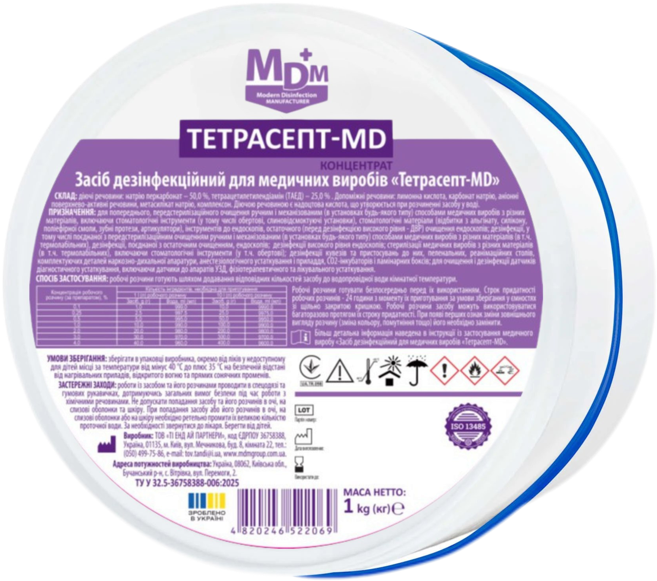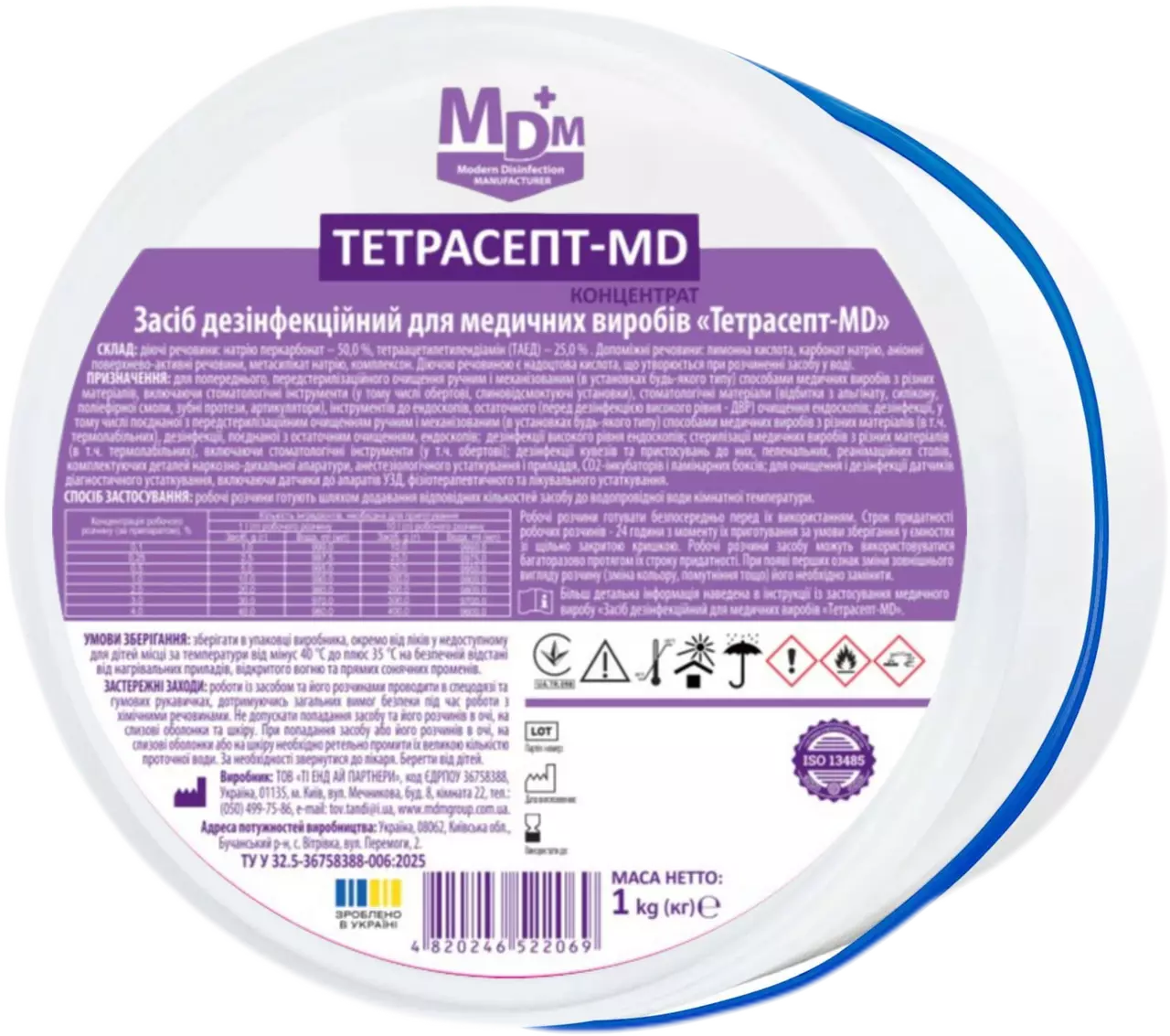 Засіб дезінфекційний для медичних виробів Тетрасепт-MD - гранульований порошковий засіб із широким спектром антимікробної дії. Після розчинення утворює надоцтову кислоту, яка забезпечує ефективну дезінфекцію, передстерилізаційне очищення, дезінфекцію високого рівня (ДВР) та стерилізацію. Розчини мають мийні та дезодоруючі властивості, не фіксують білкові та органічні забруднення, не ушкоджують інструменти та біологічно розкладаються до кисню і води.Підходить для обробки інструментів та обладнання з металу, скла, гуми, полімерів, силікону, у тому числі термолабільних матеріалів.