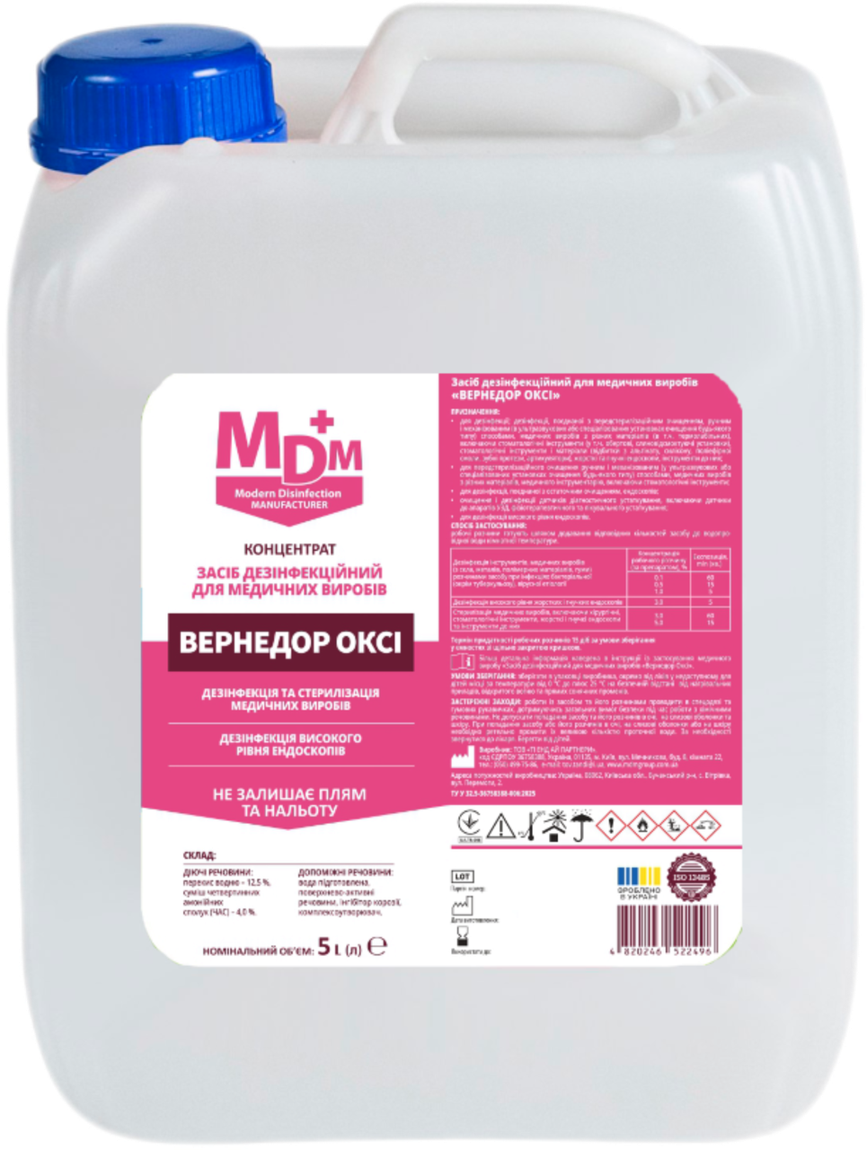 Засіб дезінфекційний для медичних виробів Вернедор-Оксі - Концентрований дезінфекційний засіб широкого спектра антимікробної дії. Має виражені бактерицидні, віруліцидні, фунгіцидні та спороцидні властивості, у тому числі проти збудників туберкульозу, гепатитів, ВІЛ, госпітальних штамів, грибкових інфекцій, спор та найпростіших. Робочі розчини мають мийні, очищувальні, емульгуючі та дезодоруючі властивості, не фіксують органічні забруднення, легко змиваються, не пошкоджують метал, скло, полімери, гуму та лакофарбові покриття. Засіб біорозкладний і придатний до використання після заморожування та відтавання.