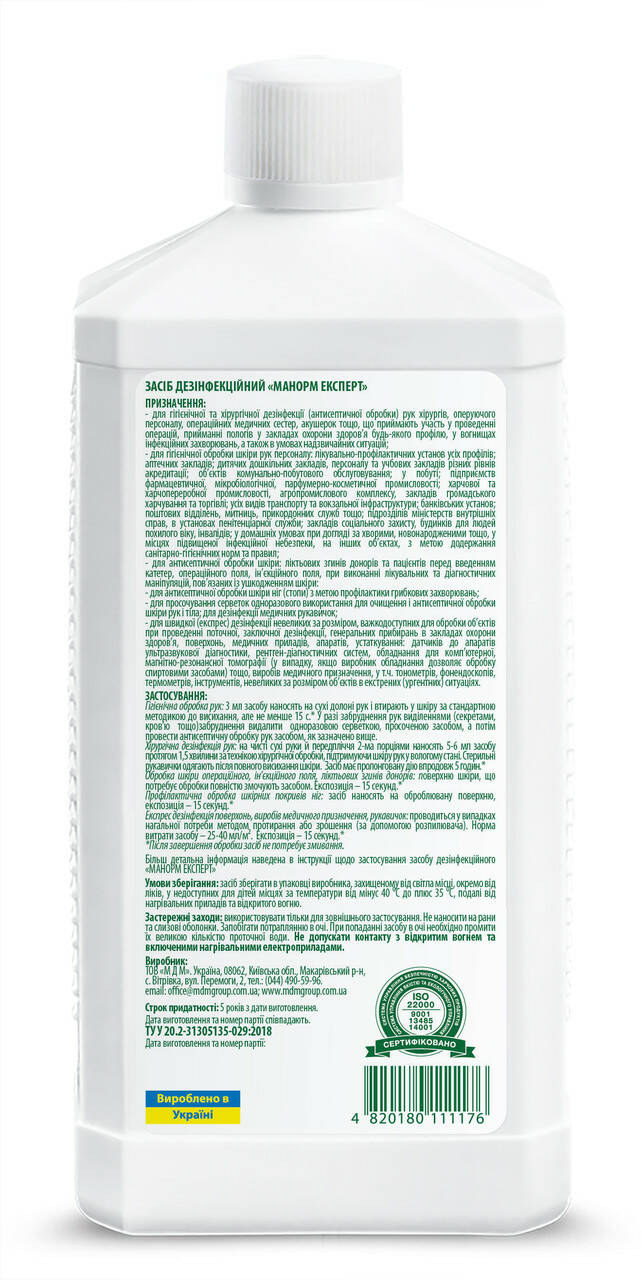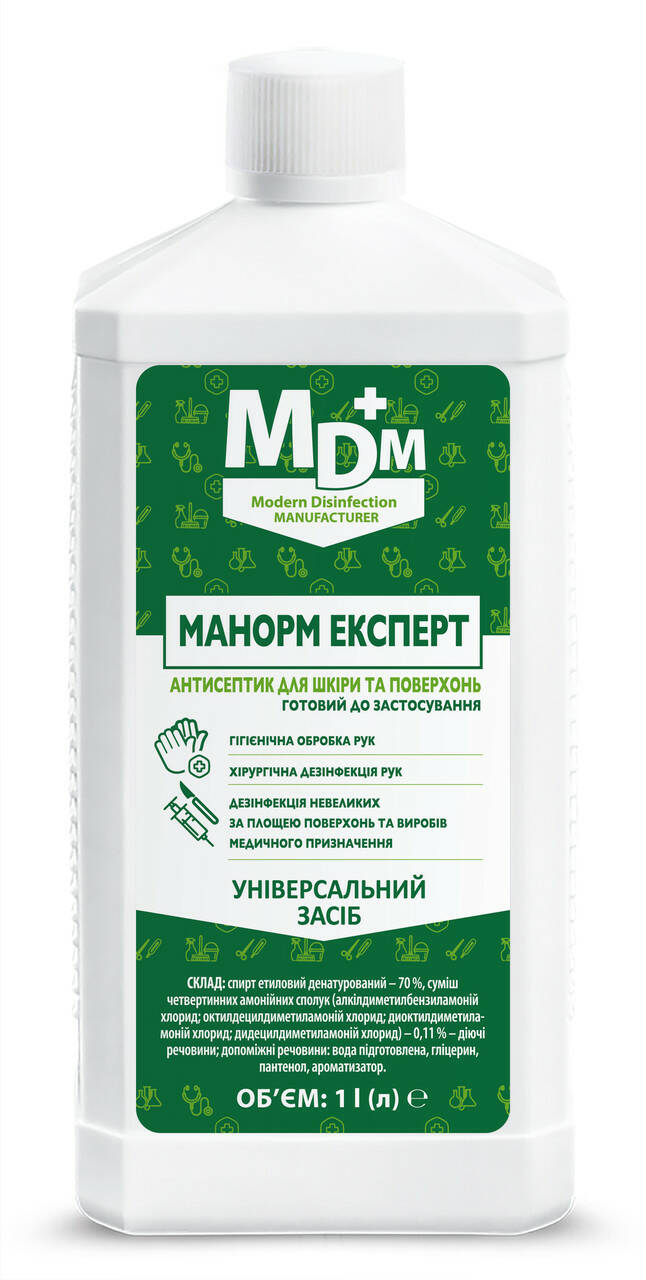 Манорм Експерт — високоефективний дезінфекційний засіб на основі 70% етилового спирту та комплексу четвертинних амонієвих сполук. Призначений для гігієнічної та хірургічної обробки рук, антисептичної обробки шкіри, профілактики грибкових захворювань стоп. Містить зволожуючі компоненти, не пересушує шкіру, не залишає липкого шару.