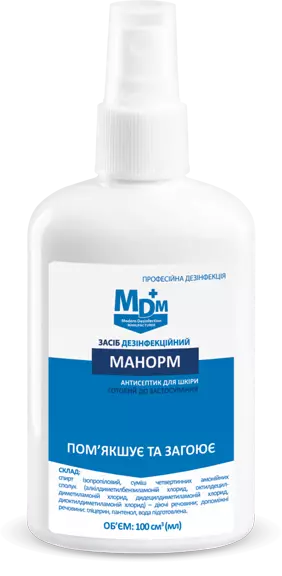 Засіб дезінфекційний Манорм — високоефективний дезінфекційний засіб на основі 60% ізопропілового спирту та комплексу четвертинних амонієвих сполук. Призначений для гігієнічної та хірургічної обробки рук, антисептичної обробки шкіри перед ін’єкціями, операціями, а також для профілактики грибкових захворювань стоп. Засіб має пролонговану антимікробну дію до 3 годин, не пересушує шкіру, не залишає липкого шару, не потребує змивання та сумісний із шкірою навіть при багаторазовому використанні.