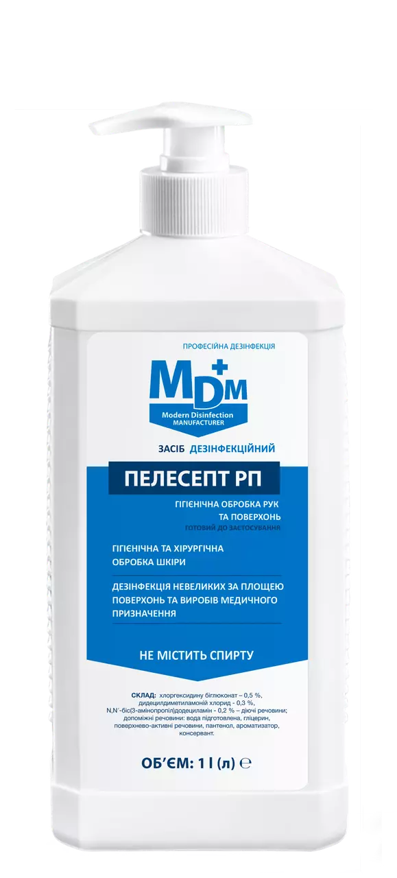 Пелесепт РП — готовий до застосування антисептичний засіб широкого спектра дії. Призначений для гігієнічної та хірургічної обробки рук, антисептичної обробки шкіри перед ін’єкціями, хірургічними втручаннями, а також для профілактики грибкових захворювань стоп. Засіб підходить для швидкої дезінфекції поверхонь, медичних інструментів, рукавичок, ендоскопів та іншого обладнання. Містить зволожуючі компоненти, не пересушує шкіру, не залишає липкого шару та забезпечує пролонговану антимікробну дію до 3 годин.