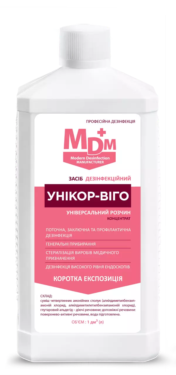 Засіб дезінфекційний «Унікор-Віго» — це високоефективний багатофункціональний дезінфекційний засіб із потужною бактерицидною, віруліцидною, фунгіцидною, спороцидною та овоцидною дією. Призначений для дезінфекції, передстерилізаційного очищення, високорівневої дезінфекції та стерилізації виробів медичного призначення, інструментів, інвентарю, поверхонь, посуду, білизни, а також для знезараження відходів і боротьби з пліснявою. Завдяки комбінації двох ЧАС (алкілдиметилбензиламонію хлорид і алкілдиметилетилбензиламонію хлорид), глутарового альдегіду та ПАР, засіб не фіксує білкових забруднень, не викликає корозії, добре змивається, не залишає слідів і плям.