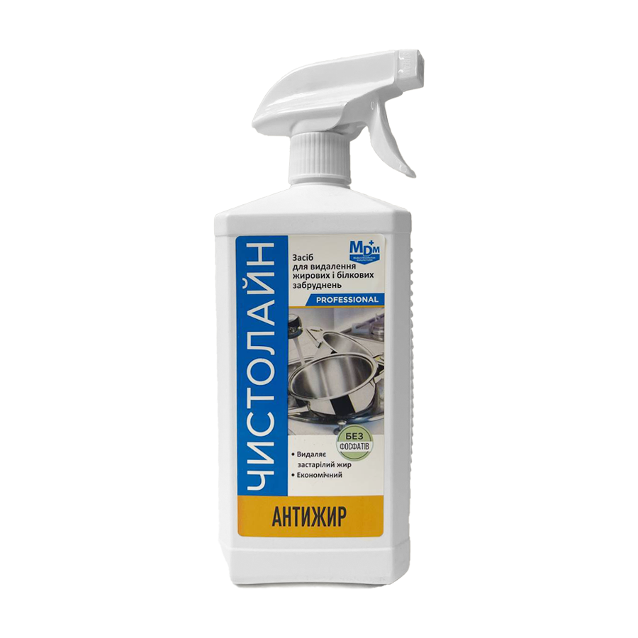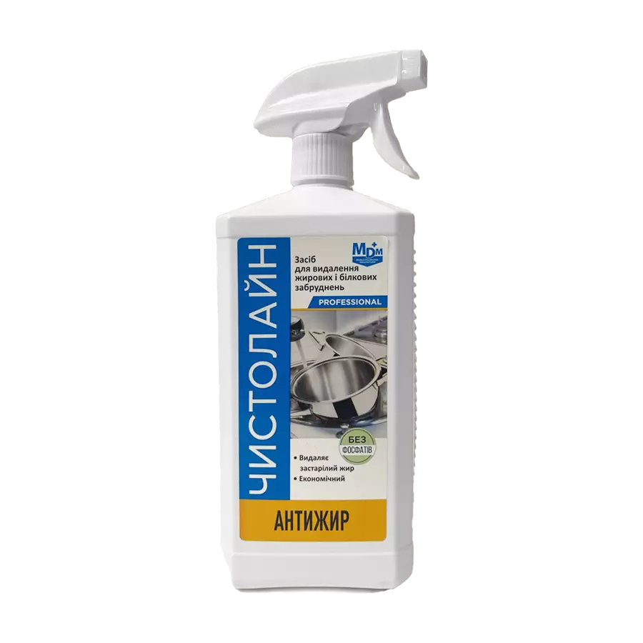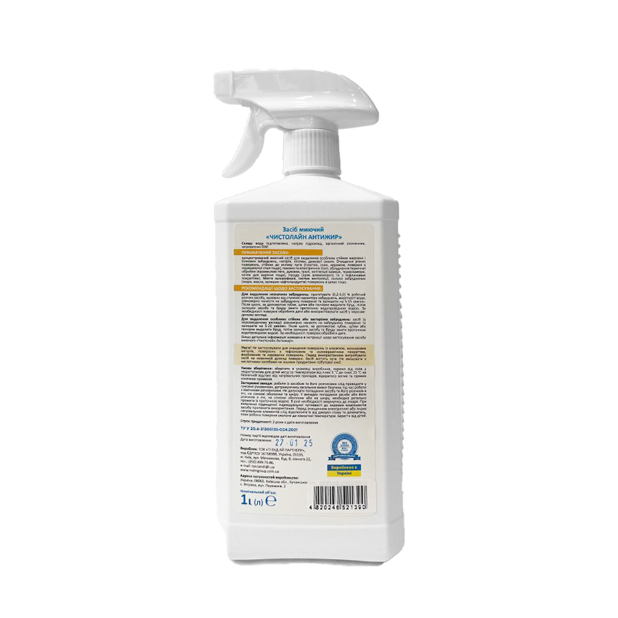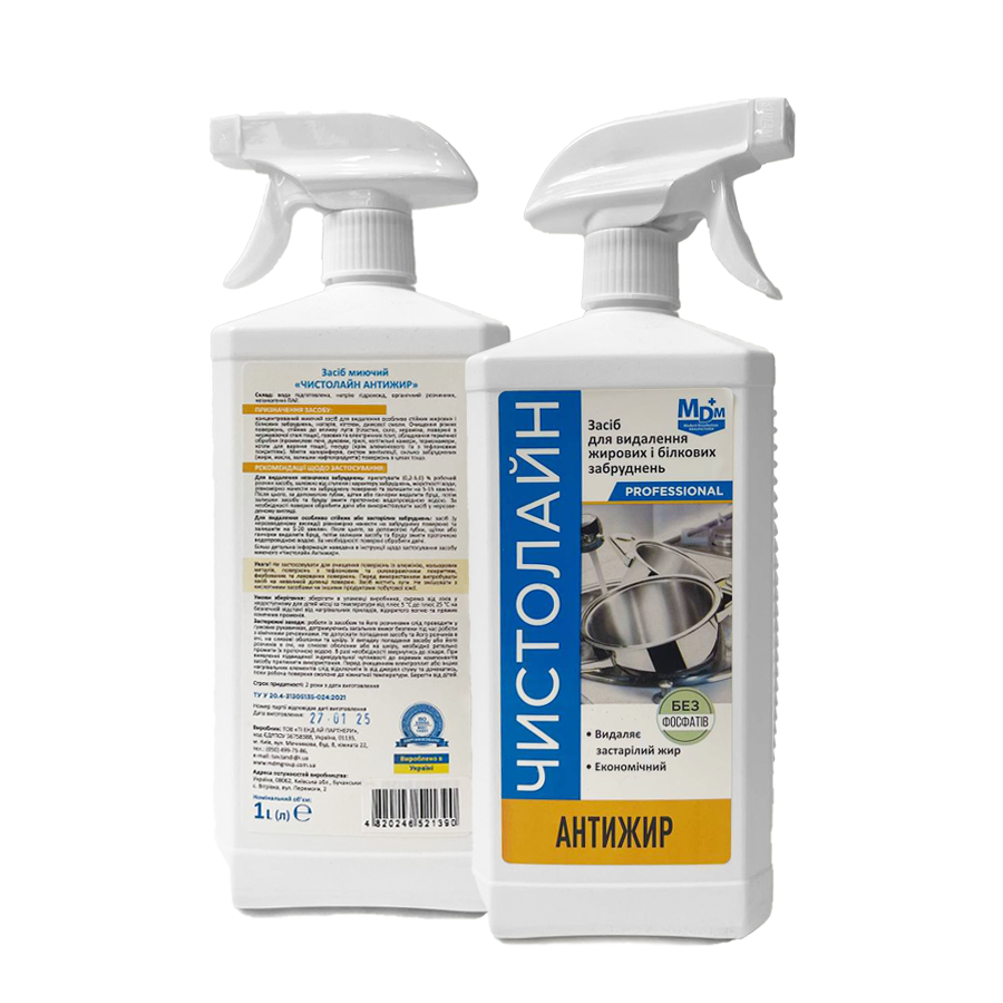 Миючий засіб «Чистолайн Антижир» — це концентрований прозорий лужний засіб із оптимальним вмістом натрію гідроксиду, органічного розчинника та неіоногенних ПАР, призначений для швидкого й ефективного видалення стійких жирових, білкових і коптильних забруднень, нагару та кіптяви з емальованих, керамічних, скляних і нержавіючих поверхонь, а також обладнання термічної обробки. Засіб не містить фосфатів і безпечний для обладнання й навколишнього середовища.