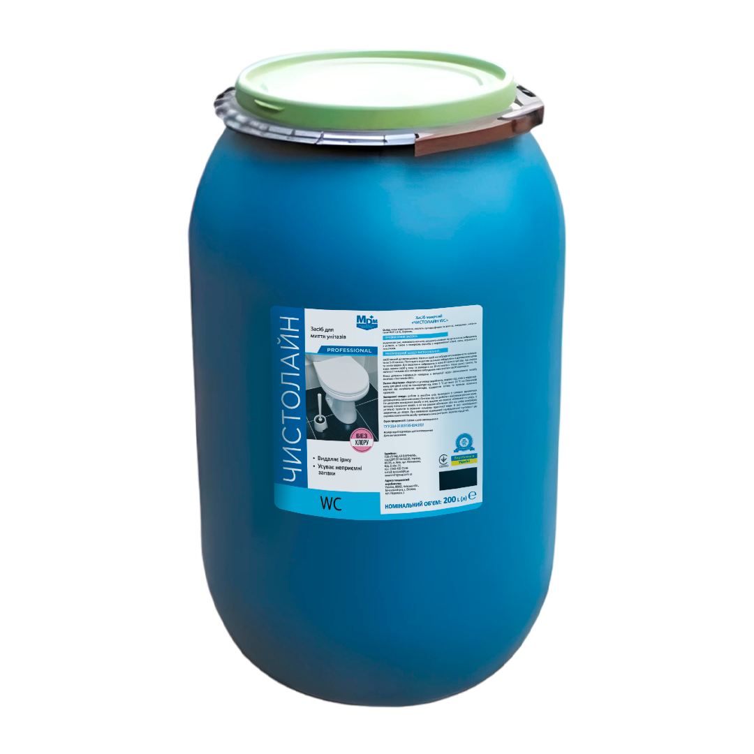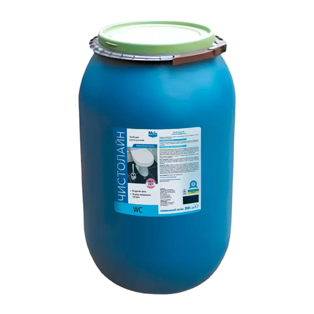 Засіб миючий Чистолайн WC 200 л (бочка) – високоефективний засіб, який має виражені миючі властивості. Призначений для чищення туалетів, ефективно видаляє іржу, вапняний наліт та сечовий камінь. Завдяки своїй спеціальній формулі, він не пошкоджує керамічні, порцелянові, скляні вироби, вироби з нержавіючої сталі, кахель, полімерні матеріали та інші поверхні. Засіб не фіксує органічні та неорганічні забруднення і легко змивається, не залишаючи слідів на поверхнях.