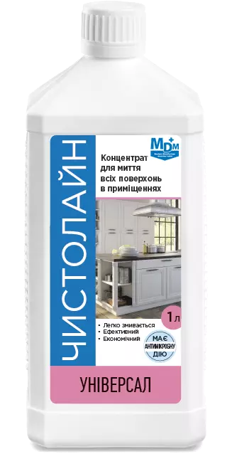 Миючий засіб «Чистолайн Універсал» — це концентрований прозорий мийний засіб із вмістом аніонних, неіоногенних і амфотерних ПАР, дезінфектанта (2-феноксіетанолу) та допоміжних компонентів. Засіб ефективно усуває органічні забруднення з різних типів поверхонь, володіє антимікробною дією, не залишає плям і нальоту, усуває неприємні запахи й не фіксує бруд. Підходить для щоденного прибирання, а також очищення сильно забруднених поверхонь, забезпечуючи гігієнічну чистоту без шкоди для оброблюваних матеріалів.