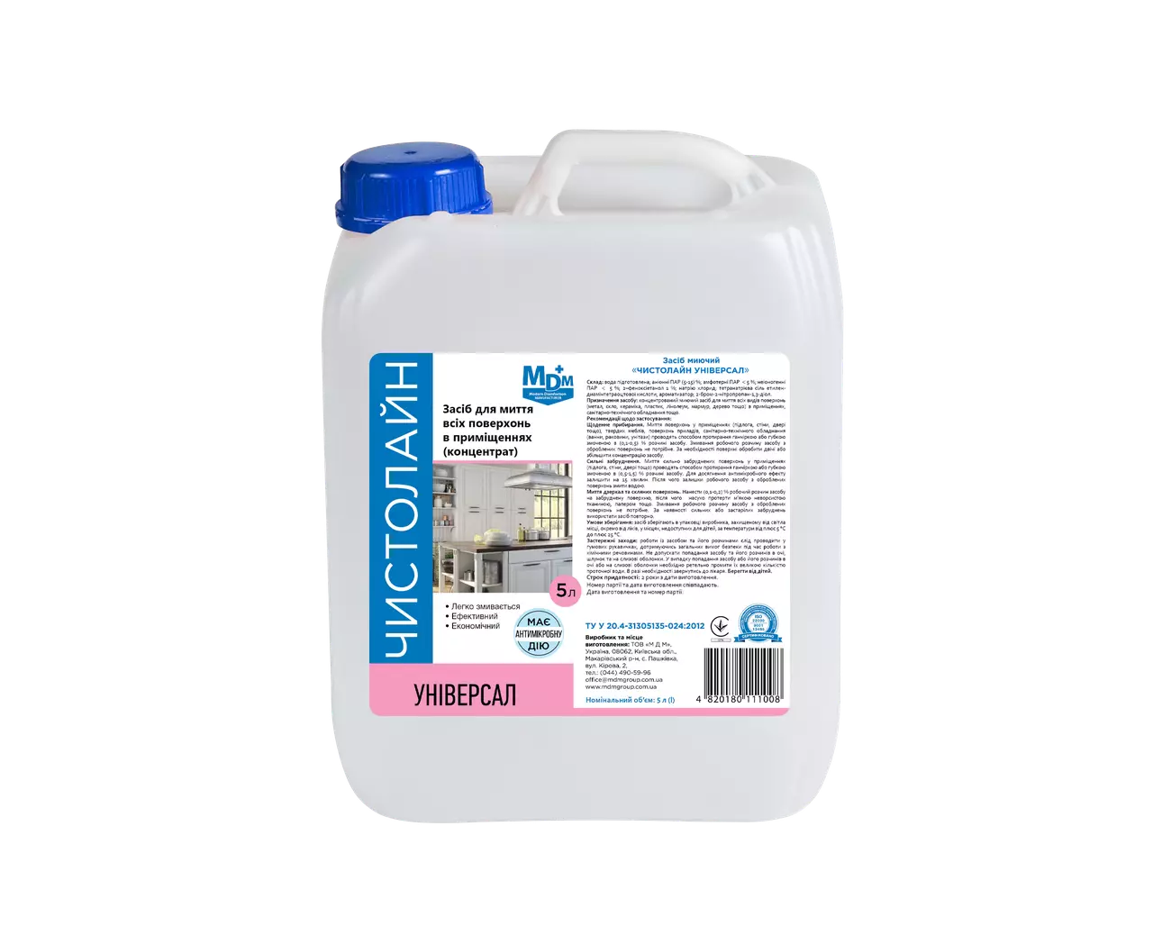 Миючий засіб «Чистолайн Універсал» — це концентрований прозорий мийний засіб із вмістом аніонних, неіоногенних і амфотерних ПАР, дезінфектанта (2-феноксіетанолу) та допоміжних компонентів. Засіб ефективно усуває органічні забруднення з різних типів поверхонь, володіє антимікробною дією, не залишає плям і нальоту, усуває неприємні запахи й не фіксує бруд. Підходить для щоденного прибирання, а також очищення сильно забруднених поверхонь, забезпечуючи гігієнічну чистоту без шкоди для оброблюваних матеріалів.