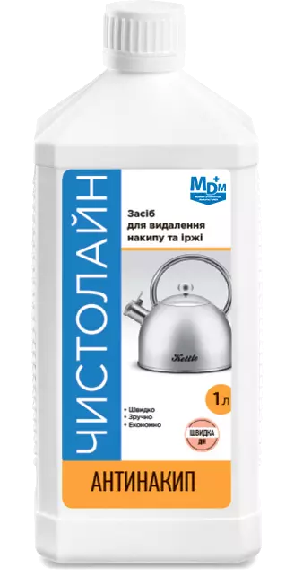 Миючий засіб «Чистолайн Антинакип» — це прозорий кислотний засіб на основі лимонної та ортофосфорної кислот із додаванням комплексоутворювача, призначений для ефективного видалення скам’янілого накипу, іржі та вапняного нальоту. Завдяки м’якій, але потужній формулі засіб безпечно очищує нержавіючу сталь, скло, кераміку, пластик, порцеляну, кахель, не залишаючи пошкоджень або фіксованих забруднень. Легко змивається водою та не містить фосфатів.