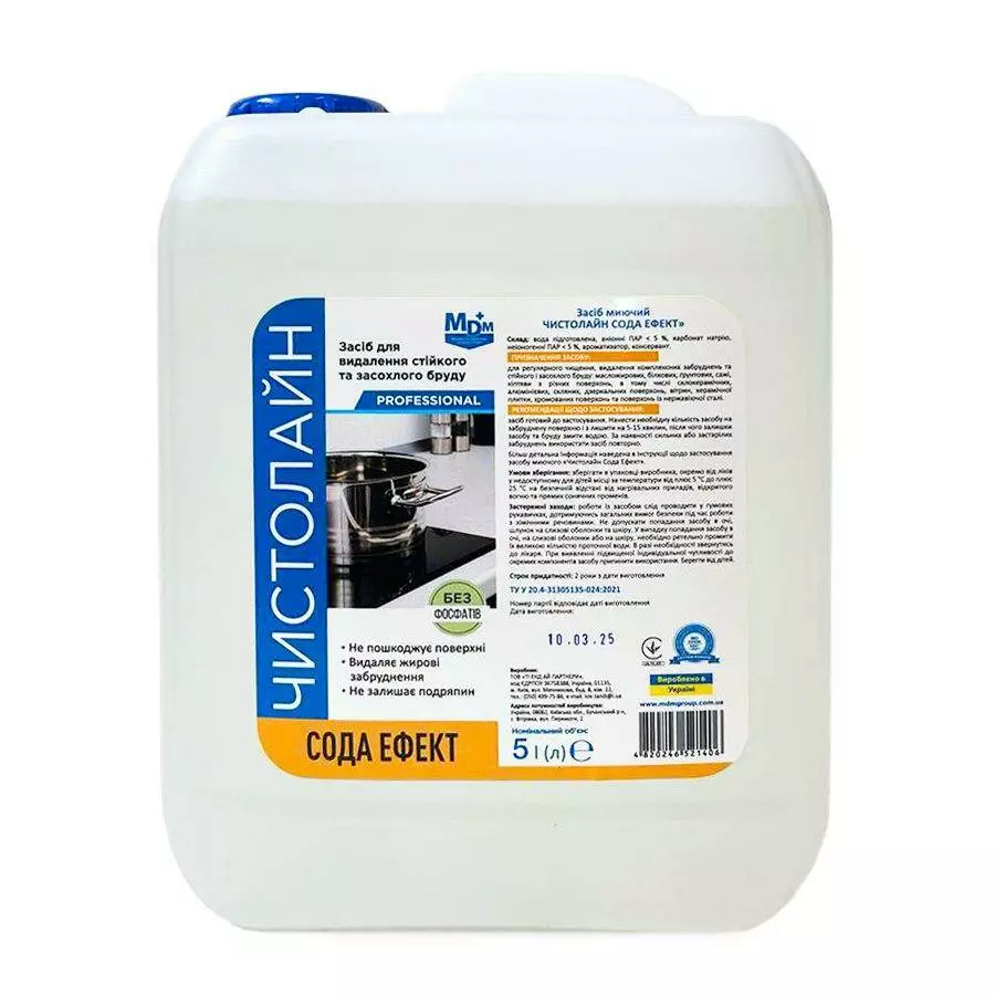 Миючий засіб «Чистолайн Сода Ефект» — це готовий до використання багатофункціональний засіб у вигляді прозорої рідини з приємним ароматом, до складу якого входять карбонат натрію, аніонні та неіоногенні ПАР, ароматизатор і консервант. Призначений для ефективного видалення стійких жирових, білкових, ґрунтових забруднень, сажі й кіптяви з широкого спектра поверхонь: алюмінієвих, склокерамічних, хромованих, керамічних, порцелянових, скляних, нержавіючої сталі та полімерів. Не залишає слідів, легко змивається і не пошкоджує делікатні матеріали.