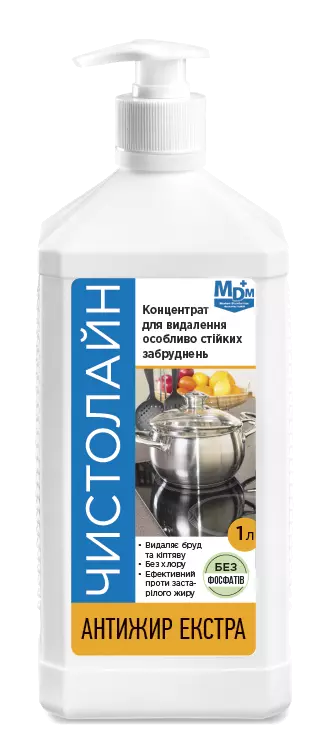 Миючий засіб «Чистолайн Антижир Екстра» — це концентрований прозорий лужний засіб із вмістом натрію гідроксиду, органічного розчинника та аніонних ПАР (5–15 %), призначений для ефективного видалення особливо стійких жирових, білкових і коптильних забруднень, нагару, кіптяви та димової смоли. Підходить для очищення емальованих, керамічних, скляних, пластикових і нержавіючих поверхонь, а також термічного обладнання. Не містить фосфатів, сумісний з різними типами виробничих і побутових поверхонь, що стійкі до дії лугів.